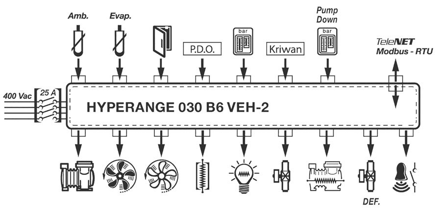 - Direkte Steuerung des Kompressors, der Kondensatorlüfter, der Kompressorölheizung, der Abtauheizungen, der Verdampferlüfter, des Magnetventils, der Zellenbeleuchtung und aller von den Vorschriften geforderten elektrischen Schutzvorrichtungen