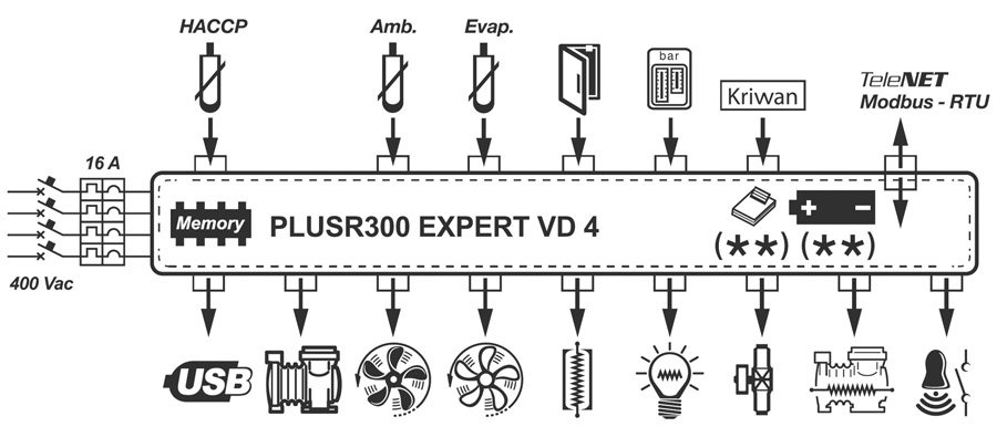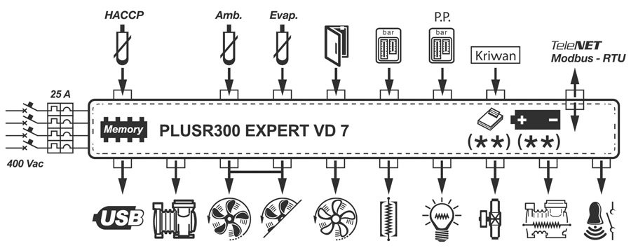 Kühlanlagensteuerung zur vollständigen Steuerung von Kühlzellen mit Dreiphasen-Verdichter bis zu 7,5HP und Datalogger-Funktion. Ein breites und rückbeleuchtetes Flüssigkristalldisplay ermöglicht die gleichzeitige Darstellung von Temperatur, Umgebungstemperatur, Verdampfertemperatur, Kalender und allen Informationen über die Kühlanlage. Der Temperaturaufzeichner zeichnet (bis zu 1 Jahr) die Umgebungstemperatur und die diesbezüglichen Alarmmeldungen mittels eines elektronischen Kreislaufs auf, der über einen eigenen unabhängigen Temperaturfühler verfügt (Richtlinie EN 12830). Das Aufzeichnungsgerät kann entfernt oder ausgetauscht werden, ohne dass dadurch die normale Arbeitsweise des Kühlzelle beeinträchtigt wird. Ferner kann ein Abtauvorgang in Echtzeit vorgenommen und die Steuerung an das Überwachungssystem TeleNET oder an das Standardprotokoll Modbus-RTU angeschlossen werden. Leitungsschutzschalter und Motorschaltschutz für Verdichter sind zugänglich über Vorderseite der Schalttafel. Dies und die innovative Form machen es zur perfekten und funktionell hochwertigen Wahl.
