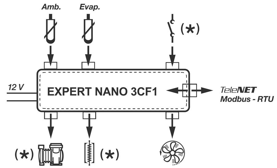 Er ist mit zwei Analogen Eingängen für Temperaturfühler NTC oder PTC, einem Digitaleingang, drei Relais für die Steuerung des Verdichters, der Gebläse und Abtauung (das Abtaurelais kann als Lichtsteuerung konfiguriert werden) und Signalton ausgestattet. Der Regler kann auch für Heizanwendungen konfiguriert werden.