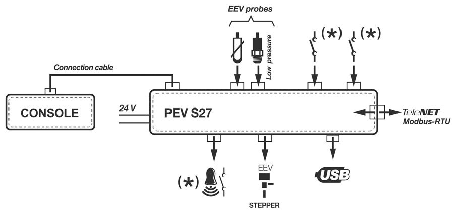 Regulador electrónico para el control de la válvula de expansión electrónica motorizada. Puede configurarse con display remoto o display integrado, gestiona las válvulas de expansión electrónicas paso a paso bipolares más habituales e integra la gestión del recalentamiento del evaporador.