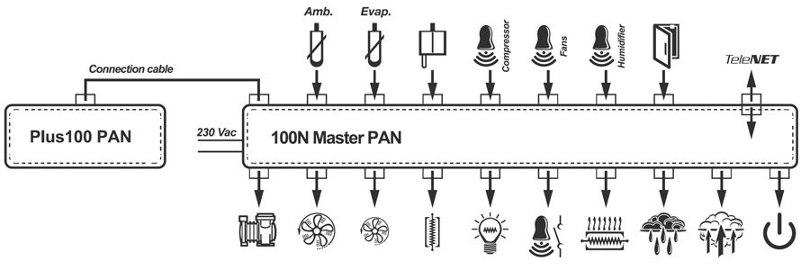 En su conjunto permite controlar el frío, el calor, la ventilación, la luz de la celda, la humidificación, la deshumidificación, las descongelaciones, las alarmas gestionando en entrada las sondas NTC ambiente y el evaporador, y la sonda de humedad 4.20 mA.