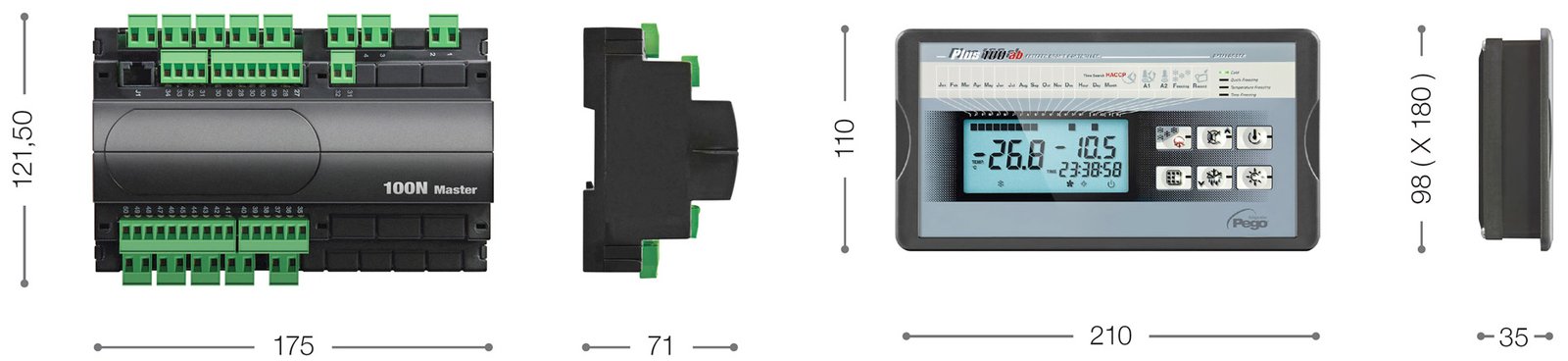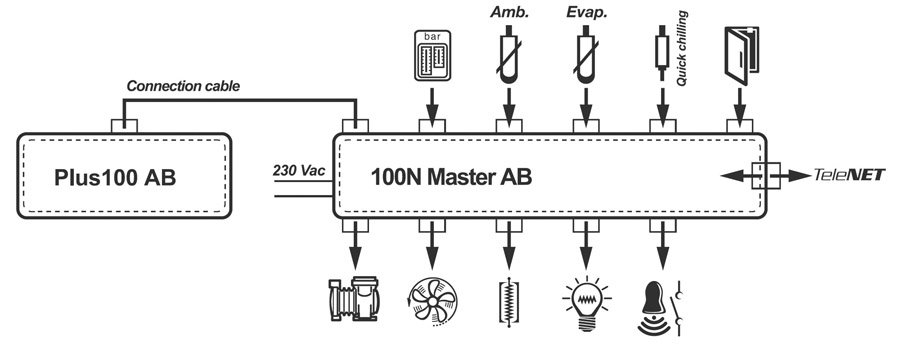 Le contrôle électronique Plus100 AB permet de gérer entièrement tous les composants d’une installation frigorifique tels que le compresseur, les ventilateurs de l’évaporateur, les résistances de dégivrage et l’éclairage de la chambre.