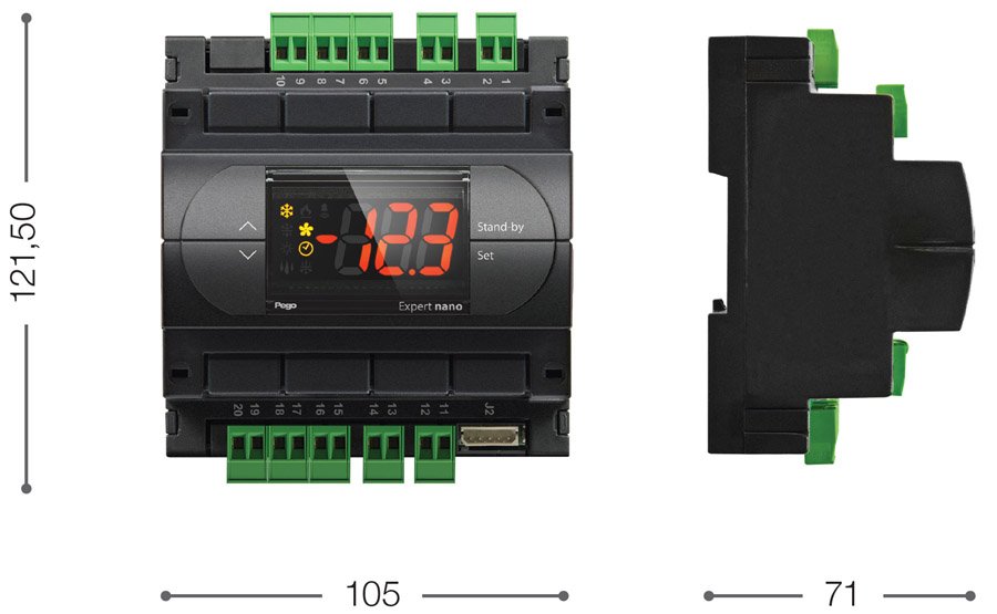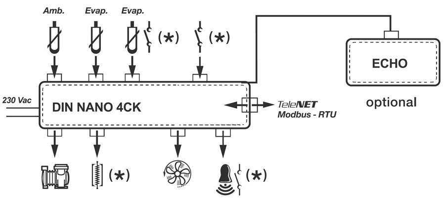 Il DIN NANO 4CK è un regolatore elettronico a 4 relè da barra DIN adatto per la gestione di banchi frigo, vetrine ed unità frigorifere statiche o ventilate, con sbrinamento a sosta o elettrico con orologio integrato (RTC). Esso è dotato di tre ingressi analogici per sonde di temperatura NTC di cui uno configurabile come ingresso digitale, un ulteriore ingresso digitale, quattro relè per la gestione di compressore, ventole, sbrinamento e allarme. Il buzzer è di serie ed il regolatore può essere configurato anche per applicazioni di chiamata caldo.