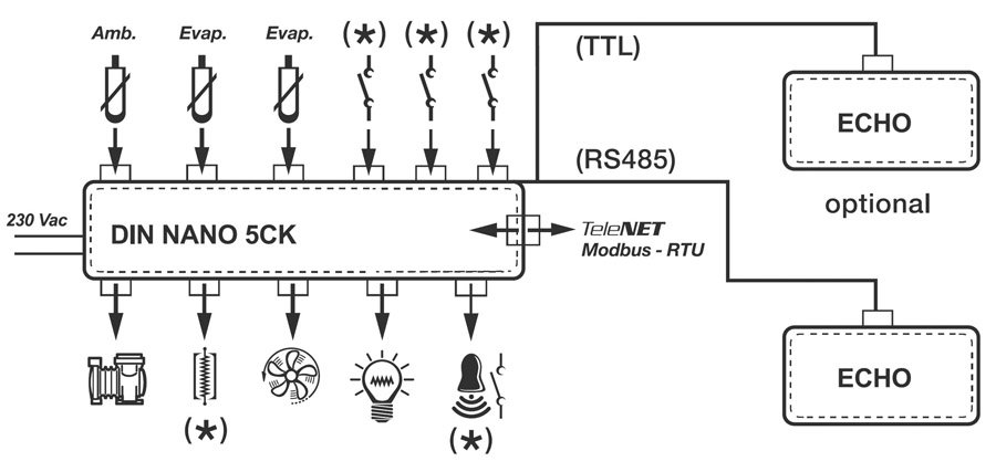 Il DIN NANO 5CK è un regolatore elettronico a 5 relè da barra DIN adatto per la gestione di banchi frigo, vetrine ed unità frigorifere statiche o ventilate, con sbrinamento a sosta o elettrico con orologio integrato (RTC). Esso è dotato di tre ingressi analogici per sonde di temperatura NTC, tre ingressi digitali, cinque relè per la gestione di compressore, ventole, sbrinamento, luce e allarme (2 relè configurabili). Il buzzer è di serie ed il regolatore può essere configurato anche per applicazioni di chiamata caldo.