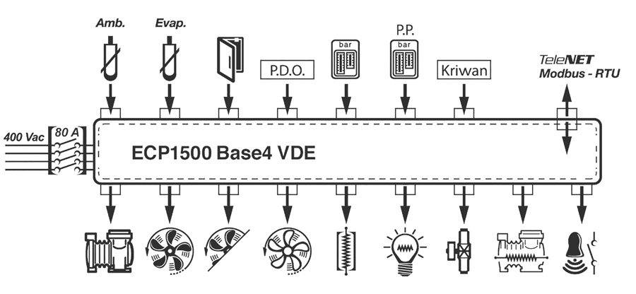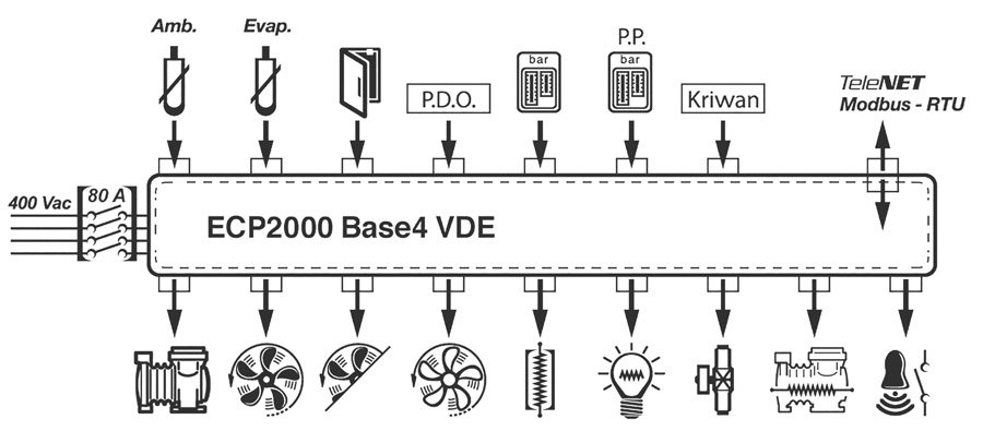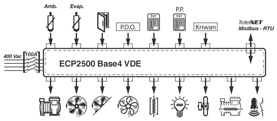 Gestione completa di impianti frigoriferi trifase fino a 25 HP statici o ventilati, con sbrinamento elettrico o a sosta.