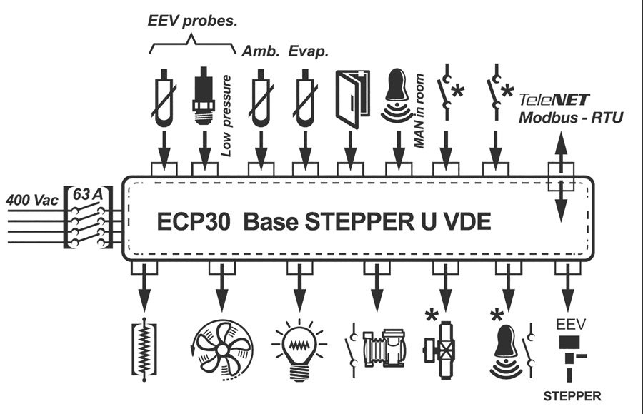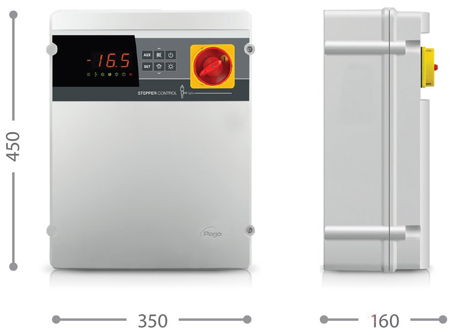 Linea di quadri di potenza con controllo della valvola di espansione elettronica (motore passo-passo) dedicati alla gestione della sola unità evaporante trifase dove le utenze sono abbinate ad una centrale frigorifera o unità motocondensante remota.