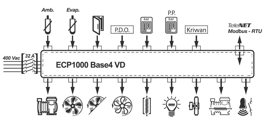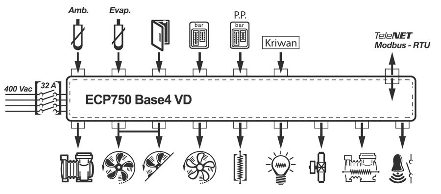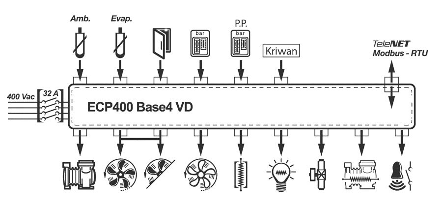 Gestione completa di impianti frigoriferi trifase fino a 10 HP statici o ventilati, con sbrinamento elettrico o a sosta.