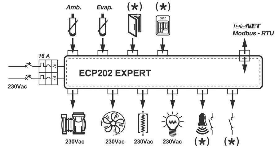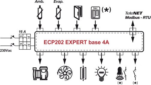 - Gestione diretta di compressore, resistenze di sbrinamento, ventilatori dell’evaporatore, luce cella con uscite in tensione collegabili direttamente alle varie utenze o contatti puliti liberi da tensione per il comando dell’unità motocondensante già provvista di quadro elettrico.