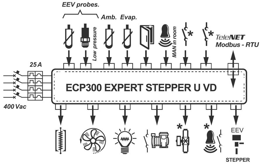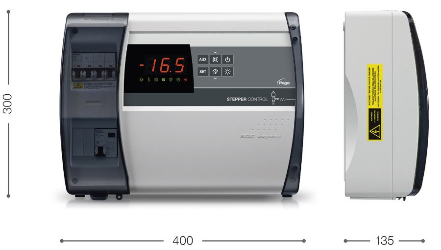 Linea di quadri di potenza con controllo della valvola di espansione elettronica (motore passo-passo) dedicati alla gestione della sola unità evaporante trifase dove le utenze sono abbinate ad una centrale frigorifera o unità motocondensante remota.