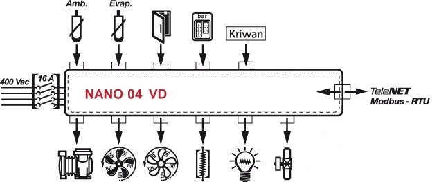 - Gestione diretta di compressore, ventole del condensatore, resistenza olio compressore, resistenze di sbrinamento, ventilatori dell’evaporatore, valvola solenoide, luce cella e tutte le protezioni elettriche previste dalle normative.