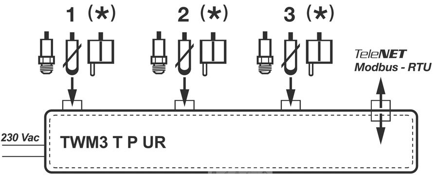 Modulo di acquisizione a 3 canali analogici per il rilevamento di temperatura, pressione o umidità relativa da connettere su una rete di supervisione TeleNET o con protocollo Modbus-RTU.