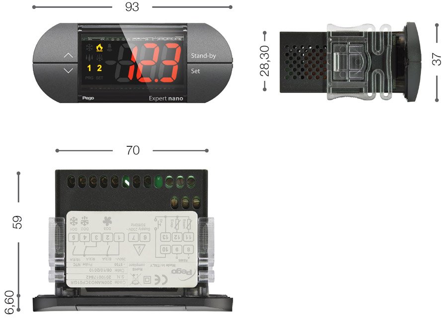 L’EXPERT NANO 2ZN è un termoregolatore elettronico a 2 relè per la chiamata caldo/freddo o umidifica/deumidifica in zona neutra o gestione del doppio set point di chiamata caldo/umidifica o freddo/deumidifica con 2 uscite distinte. E’ dotato di un ingresso analogico per sonda di temperatura NTC, un ingresso analogico per sonda di umidità, due relè con contatti separati e uscita RS485 per sistema di monitoraggio (TeleNet o Modbus-RTU selezionabile da parametro). Il buzzer è di serie el’alimentazione elettrica è in base al modello.